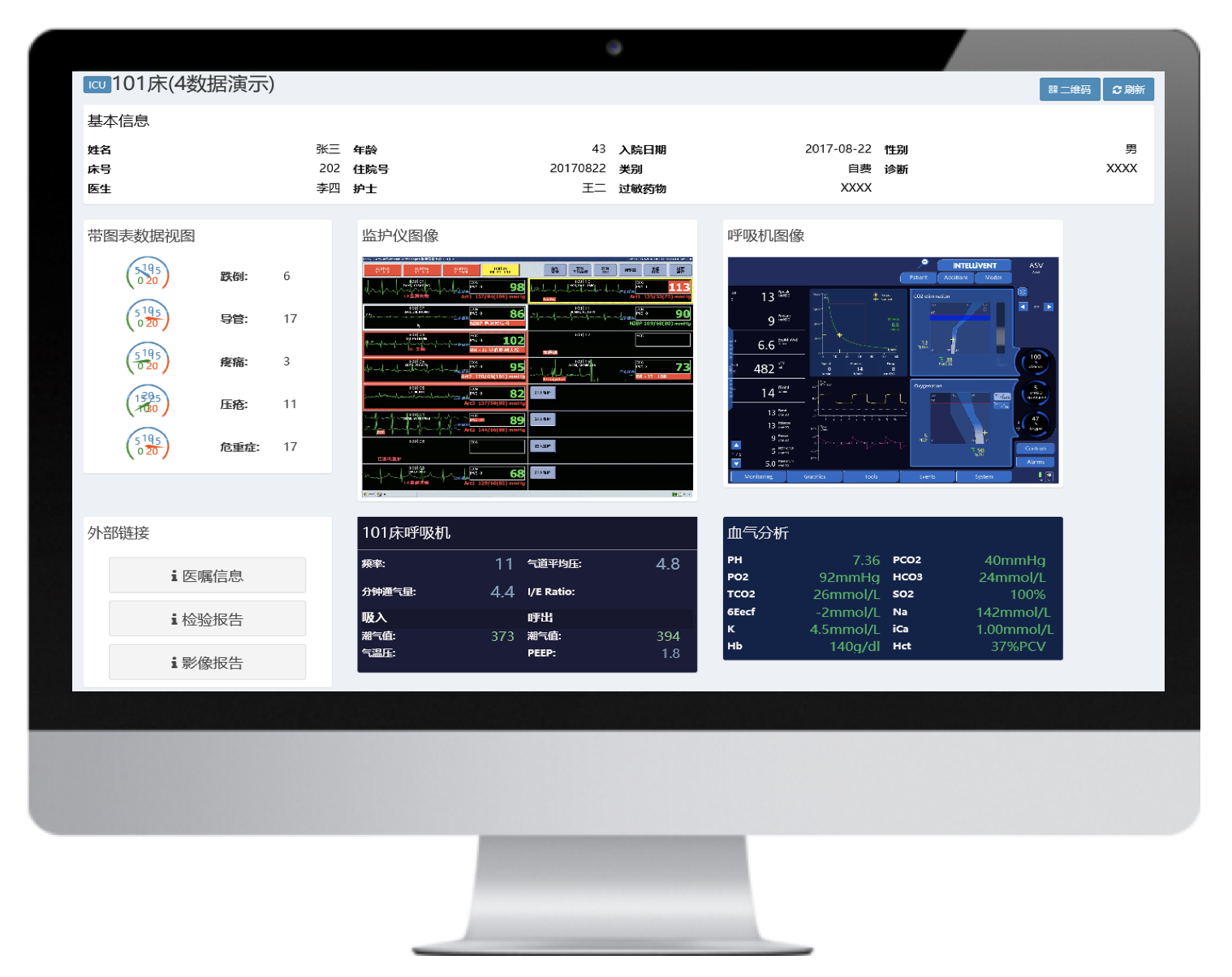 實(shí)時(shí)呈現(xiàn)病人體征參數(shù)、變化趨勢,診療設(shè)備參數(shù),同時(shí)接入醫(yī)囑、檢驗(yàn)結(jié)果數(shù)據(jù),一體化呈現(xiàn)存儲和回溯,方便醫(yī)護(hù)急救、會(huì)診、查房